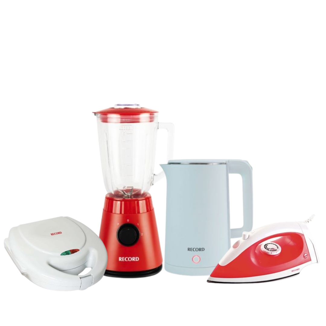 - Incluye: Hervidor Eléctrico 1.8L + Licuadora Record Classic Collection Roja + Sandwichera Blanca + Plancha Seca y a VaporHervidor Eléctrico 1.8 L – Blanco• Calienta el agua rápidamente y con seguridad.• Capacidad: 1.8 litros• Luz LED indicadora y visor de nivel de agua para un uso práctico.• Diseño moderno en color blanco, elegante y fácil de limpiar. Licuadora Record Classic Collection – Roja• Vaso de vidrio resistente de 1.5 L.• Cuchilla de 4 hojas de acero inoxidable para triturar y mezclar con potencia.• 4 velocidades + función pulsador para diferentes preparaciones.• Diseño clásico en vibrante color rojo, potente y duradero.• Ideal para smoothies, jugos, salsas y sopas.Sandwichera Blanca• Diseño compacto y elegante en color blanco.• Potencia: 750Whatts• Placas antiadherentes para una cocción pareja y limpieza sencilla.Plancha Seca y a Vapor• Ofrece dos modos de uso: seco o a vapor, según el tipo de tejido.• Base antiadherente que se desliza suavemente.• Selector de temperatura y vapor para un planchado preciso.• Ideal para mantener tu ropa impecable y sin arrugas en menos tiempo