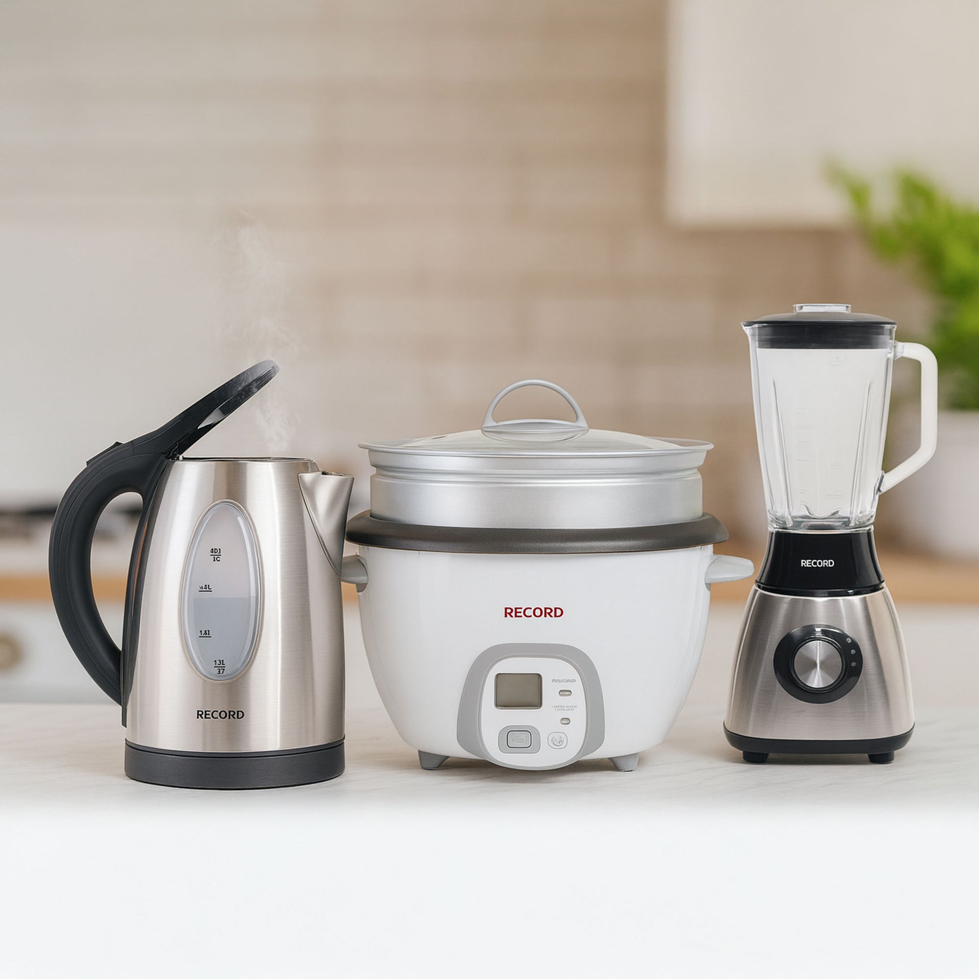 - Hervidor Inox 1.8 L• Fabricado en acero inoxidable de alta calidad.• Capacidad: 1.8 litros.• Incluye luz LED indicadora y visor de nivel de agua.• Filtro interior para mayor seguridad y pureza del agua.Arrocera Multiusos Record 1.8L Blanca• Capacidad: 1.8 litros• Carcasa de acero inoxidable pintada, resistente y fácil de limpiar.• Tazón interior antiadherente que evita que el arroz se pegue y facilita la limpieza.• Tapa de vidrio templado con salida de vapor para un control seguro.• Vaporera exterior en aluminio, perfecta para cocinar al vapor vegetales o carnes.• 3 funciones: cocción, mantener caliente y sofrito.• Incluye espátula y taza medidora para mayor practicidad.• Potencia: 600 Watts Licuadora Record Inox 1.5 L (Modelo: REC-INLAC600)• Capacidad: 1.5 litros.• Cuchilla de 4 hojas en acero inoxidable.• Vaso de vidrio refractario resistente y fácil de limpiar.• 4 velocidades + función pulsador para un control preciso.• Cuerpo en acero inoxidable o rojo metalizado.• Base antideslizante para mayor estabilidad.• Potencia: 600 Watts.