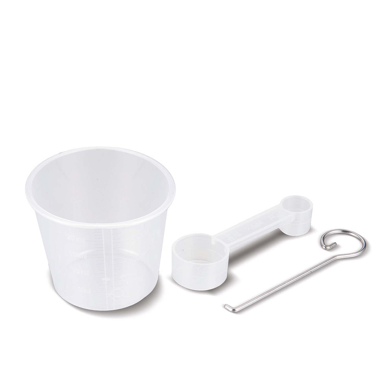 - Incluye taza medidora, cuchara medidora y gancho.